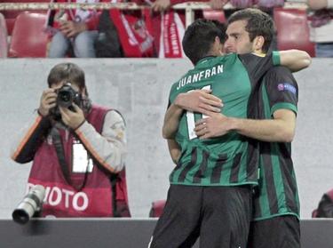Baptistao celebra con Juanfran su gol al Sevilla. | EFE Encarrila el pase a cuartos (0-2) El Betis asalta el Pizjuán Los verdiblancos, en clara mejoría tras la llegada de Gabriel Calderón, han ganado al eterno rival con goles de Baptistao y Salva Sevilla. El Valencia golea en Bulgaria Juventus y Nápoles se complican