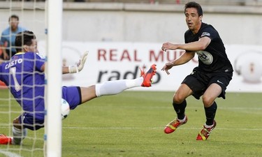 Pedro (d) bate al portero del Real Murcia. | EFE