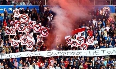 La pancarta contra el wifi que lucieron los seguidores del PSV. Curiosa protesta de la afición del PSV "Que le den al wifi, anima al equipo"