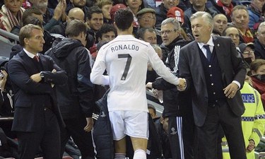 Ancelotti saluda a Cristiano Ronaldo tras cambiarle ante el Liverpool. | EFE