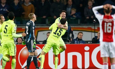 Messi celebra con Bartra su primer gol al Ajax. | Cordon Press Victoria sin brillo en Holanda (0-2) Messi empuja al Barça a octavos e iguala el récord de Raúl Dos goles del argentino han dado a los azulgranas una victoria con más oficio que brillo en el Amsterdam Arena. NARRACIÓN, por Dani Ortín