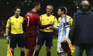 Cristiano y Messi, saludándose antes del partido. | EFE