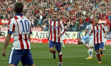 Griezmann (c) celebra su gol al Málaga. | EFE Fin a la gran racha del Málaga (3-1) El Atlético, práctico y seguro en casa David Vinuesa 2 Tiago, Griezmann y Godín, por los colchoneros, y Santa Cruz, por los andaluces, marcaron los tantos. Ambos equipos acabaron con diez. NARRACIÓN, por JM Puertas