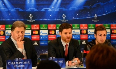 Xabi Alonso (c) y Mario Götze (d), en rueda de prensa. | Twitter En rueda de prensa en Manchester Los contrastes del Bayern: Xabi Alonso en traje y Götze en chándal G.D.