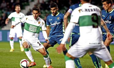 Coro, del Elche, trata de zafarse de la defensa pucelana. | EFE Gana al Valladolid (1-0) El Elche obtiene el premio del Barcelona