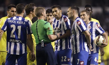 Los jugadores del Deportivo protestan una decisión al árbitro Hernández Hernández. | EFE Reparto de puntos que no contenta a nadie (1-1) Jaume Costa adelantó al Villarreal al comienzo de la segunda mitad con un golazo, pero Celso Borges empató sólo dos minutos después.
