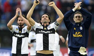 Alessandro Lucarelli (centro) se dirige a los aficionados del Parma tras un encuentro en Milán | Cordon Press Alessandro Lucarelli, el último romántico del fútbol José Manuel Puertas