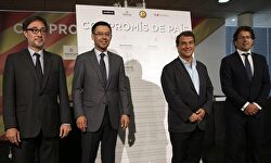 Los cuatro candidatos a la presidencia: Benedito, Bartomeu, Laporta y Freixa. | EFE Trabajo, fútbol y familia, en la jornada de reflexión de los candidatos "Pogba iría al Barça si gana Laporta" "Procesado por culpa de 'Bartusell'" Todos contra Bartomeu en el debate La semana decisiva