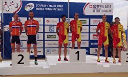 Ignasi Ávila, Joan Font, Noel Martín y Carlos González en el podio de Nottwil. | Twitter España brilla en el Mundial de ciclismo adaptado David Vinuesa