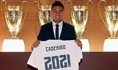 Casemiro posa con su camiseta con el año 2021. | Real Madrid Casemiro renueva hasta 2021 con el Real Madrid El conjunto blanco hizo oficial la ampliación de contrato del jugador brasileño.