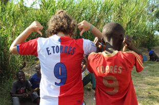Alejandra Carretero (I), con su camiseta de Fernando Torres, junto a niños de Mwanza | LD Fútbol para cambiar Tanzania, el sueño de una colchonera José Manuel Puertas