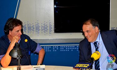 De la Morena y Tebas| Twitter De la Morena y Tebas, una relación muy productiva V. Azpitarte/ A. Somoza El afamado periodista deportivo y el presidente de la liga de fútbol profesional, muy unidos.