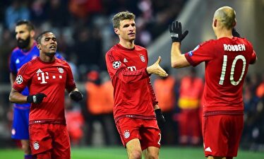 Müller (c) celebra con Douglas Costa (i) y Robben su gol al Olympiacos. | EFE Bayern, Arsenal y Chelsea, a ritmo de goleada Los bávaros sellan su pase a octavos como primeros de grupo. Los blues han endosado un 0-4 al Maccabi y los gunners, un 3-0 al Dinamo de Zagreb.