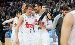 Luka Doncic (7), felicitado por Ayón (14) al final del partido en Bilbao | ACB Photo Cuando la larva se hizo mariposa José Manuel Puertas