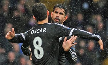 Diego Costa celebra su gol junto a Oscar. | EFE El Chelsea ya gana con Hiddink El City remonta en tres minutos El Arsenal, líder en solitario