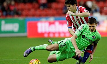 Jorge Meré lucha por un balón con Scepovic. | EFE Sarabia guía la remontada exprés del Getafe (1-2) Sanabria hizo el 1-0, pero los azulones dieron la vuelta al marcador en dos minutos por medio de Cala y Pablo Sarabia. Pedro León falló un penalti.