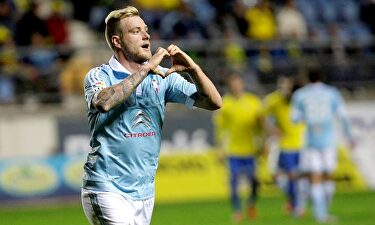 John Guidetti celebra uno de sus dos goles en el Ramón de Carranza. | EFE Guidetti pone al Celta con pie y medio en cuartos (0-3) Doblete del sueco. Entre medias marcó Jonny. Los celestes se reencuentran con la victoria después de dos derrotas consecutivas en Liga.