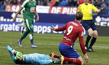 Torres marcó, al fin, su gol 100| EFE Cabezazo a cabezazo y centenario de Fernando Torres (3-1) David Vinuesa El Atlético remontó el gol de Keko con goles de Giménez y Saúl. Fernando Torres cerró el marcador con el 3-1 final y su gol oficial número 100. Narración, por José Manuel Puertas