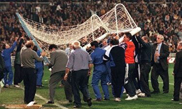 Reemplazo de la portería del fondo sur del Bernabéu en aquel partido ante el Borussia Dortmund. El Dortmund bromea con el incidente de la portería del Bernabéu
