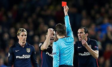 Felix Brych, en el momento en que muestra la roja a Fernando Torres. | EFE El Atlético sale vivo del Camp Nou pese a un lamentable Brych (2-1) David Vinuesa Torres fue expulsado diez minutos después de marcar el 0-1. Doblete de Luis Suárez para remontar. El uruguayo debió ver la roja por agresión. NARRACIÓN, por G. Domínguez