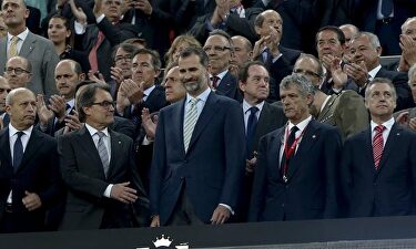El Rey Felipe VI, en el palco del Camp Nou junto a Artur Mas y Ángel María Villar. | EFE La Audiencia ordena reabrir la investigación de la pitada al himno Fernando Lorente La Sala de lo Penal entiende que los hechos pueden ser delictivos por el "ambiente institucional respecto de la independencia de Cataluña".