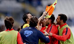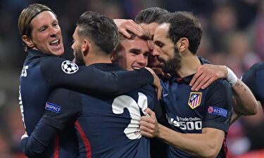 Los jugadores del Atlético de Madrid felicitan a Griezmann (c) por su gol al Bayern. | EFE El Atlético salda su cuenta con el Bayern (2-1) David Vinuesa El gol de Griezmann y las paradas de Oblak, determinantes. Müller falló un penalti y Torres otro. Tercera final para los colchoneros. NARRACIÓN, por G. Domínguez