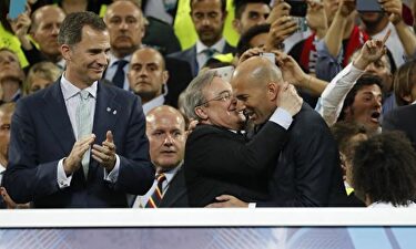 Florentino Pérez se abraza con Zidane en presencia del rey Felipe VI. | EFE Florentino: "Quiero dedicar este título a los aficionados de Irak asesinados" Lewandowski retoma el contacto con el Real Madrid Zidane: "Lo hemos conseguido con esfuerzo y trabajo"