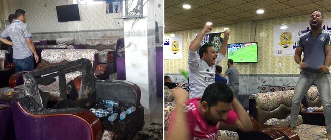 Peña Madridista de Balad tras el ataque terrorista el pasado 13 de mayo (i) y el mismo local este sábado (d) | Imagen video La peña madridista de Irak desafió al EI en la final de Champions