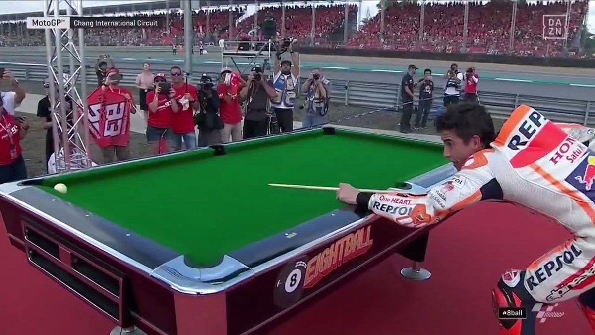 Marc Márquez emuló a un experto jugador de billar y embocó a la primera, en un tapete improvisado, la bola negra con el número ocho, justo los títulos que lleva conseguidos