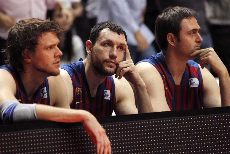 Los jugadores del Regal Barcelona mostraron caras de decepción al término del quinto y definitivo partido de la final de la Liga ACB.