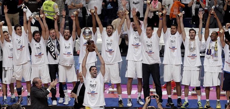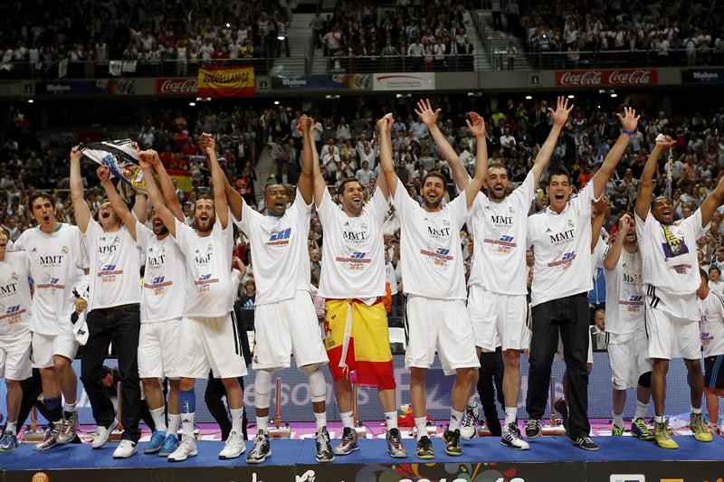 Felipe Reyes, capitán del Real Madrid, fue el encargado de levantar el trofeo ante los miles de aficionados blancos que disfrutaba en el Palacio de Deportes de la Comunidad de Madrid.