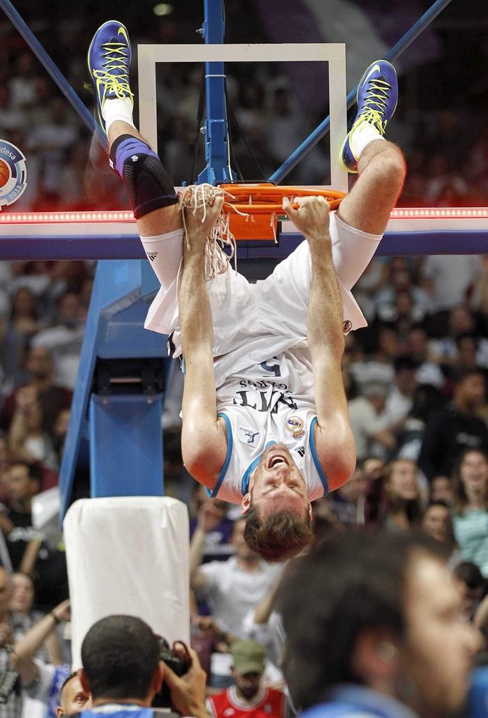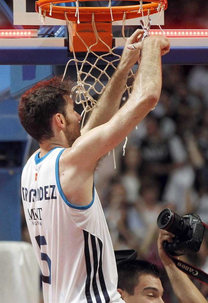 El jugador del Real Madrid Rudy Fernández mostró su alegría colgándose de la canasta.