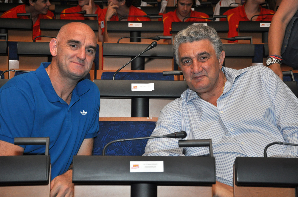Fernando Romay no quiso perderse la puesta de largo de la selección española. En la imagen, el pívot posa junto a Alfonso Churruca, jefe de prensa del Baskonia.