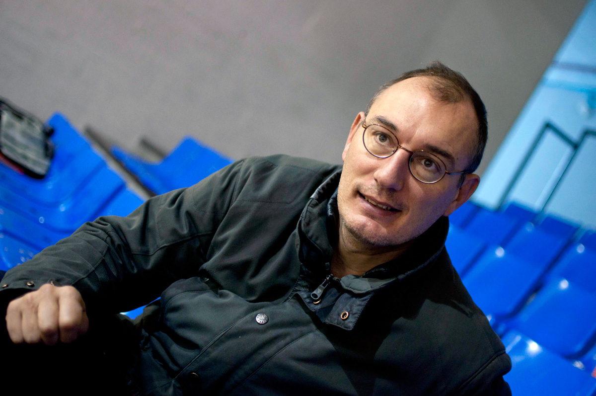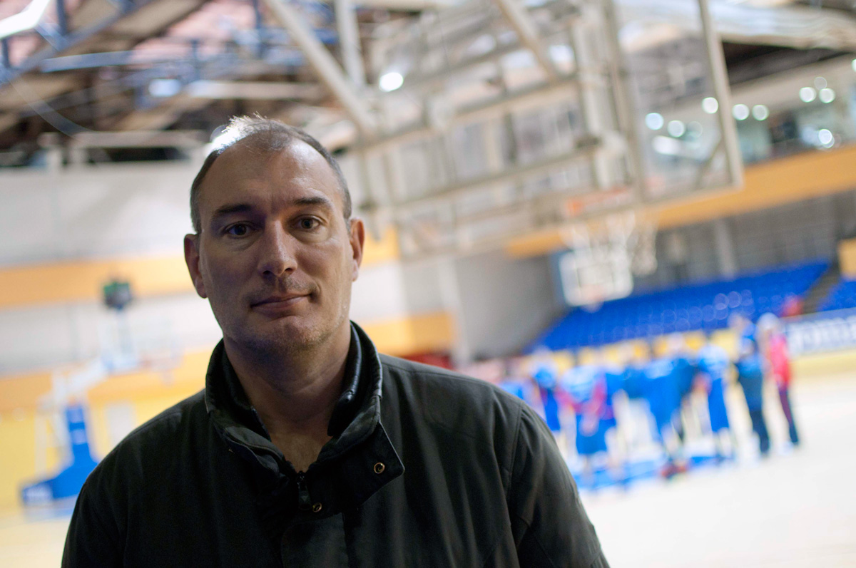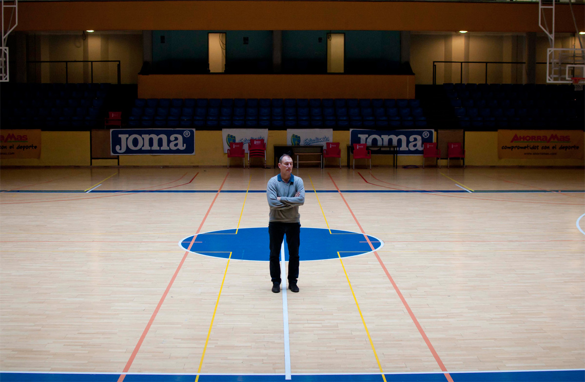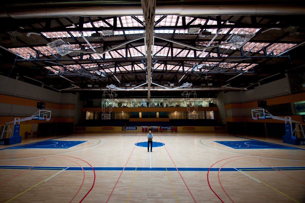 La inmensidad del pabellón vació no incomoda al exjugador del Estudiantes que acepta posar en medio de la pista.