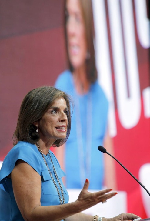 Ana Botella, durante su discurso en la sede de Endesa. La alcaldesa de Madrid dijo que es una "satisfacción compartir escenario con estos jugadores y poder mostrar el apoyo incondicional de todos para que consigan el mejor resultado posible". "Los deportistas de elite son fundamentales para el deporte de base", indicó la alcaldesa, que resaltó que "en Madrid hay 70.000 jugadores de baloncesto que intentan imitar a estos jugadores".