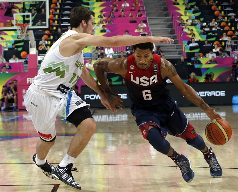 Rose entró en la pista y su equipo, tras una canasta del base de Chicago, se fue de cinco (10-15), lo que obligó al primer tiempo muerto de los eslovenos. El equipo europeo continuó con problemas para armar algún lanzamiento fácil frente la alta intensidad y robos de su rival, y tras el primer triple de Estados Unidos, a falta de 2:13 para el final, obra de Curry, el equipo americano entraba en sus mejores minutos (15-26).