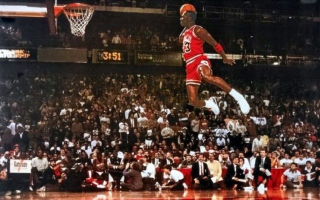 El mate más famoso de Michael Jordan. Se jugaba la victoria en el concurso de mates del All Star de 1988 ante Dominique Wilinks, de Atlanta, al que acabó superando con este espectacular salto.