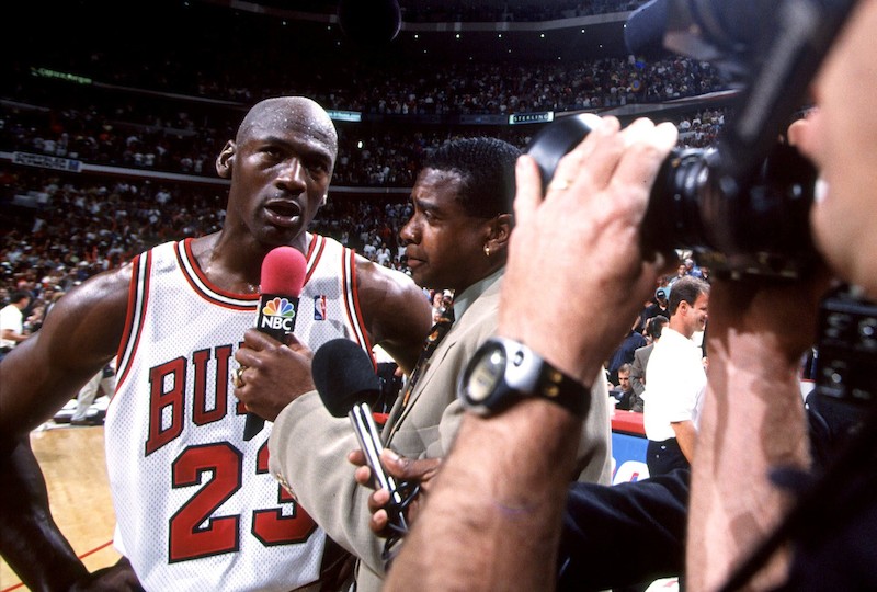 Ésta es la cara de un hombre que acaba de conseguir la victoria en el último momento. Michael Jordan acababa de anotar otro de sus winning shots. Ante Bryon Russell, su defensor, consiguió esa famosa canasta con retroceso.