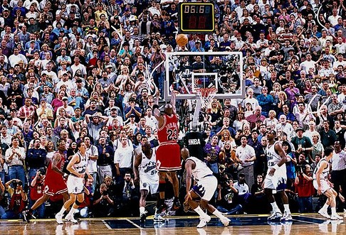 The Shot. El auténtico tiro. Una de sus imágenes más famosas. Apenas seis segundos cuando salta ante Byron Russell en el sexto partido de la final del 98 ante Utah Jazz. Sexto partido, 6 segundos y sexto título para los Bulls.