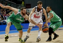 Sergio Rodríguez (c) lucha por el balón con Kaimakoglou (i) y Curtis Jerrells. | EFE