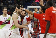 Los jugadores del Laboral Kutxa celebran la victoria y el pase al Top 16. | EFE