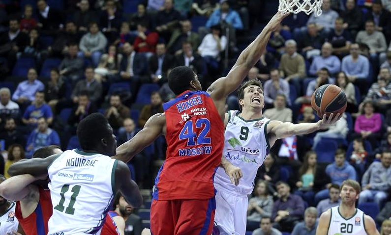 Los seis triples conseguidos por el equipo ruso, dos del base serbio Milos Teodosic y otros dos de De Colo (14 puntos), sepultaron al Unicaja pese a que la formación española intentó frenar a los tiradores locales en la defensa. Un tímido acercamiento (37-33, m.13) del Unicaja, con el ala-pívot estadounidense Will Thomas haciendo daño (9 puntos), fue quizás por la relajación de los moscovitas, que se tomaron un pequeño descanso, pero el marcador volvió a subir (54-41) con un triple de Teodosic que desmotivó la reacción visitante.