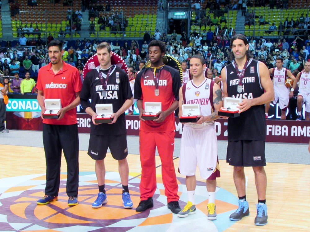 Ayón (México), Nocioni (Argentina), Wiggins (Canadá), Guillent (Venezuela) del torneo FIBA Américas 2015.
