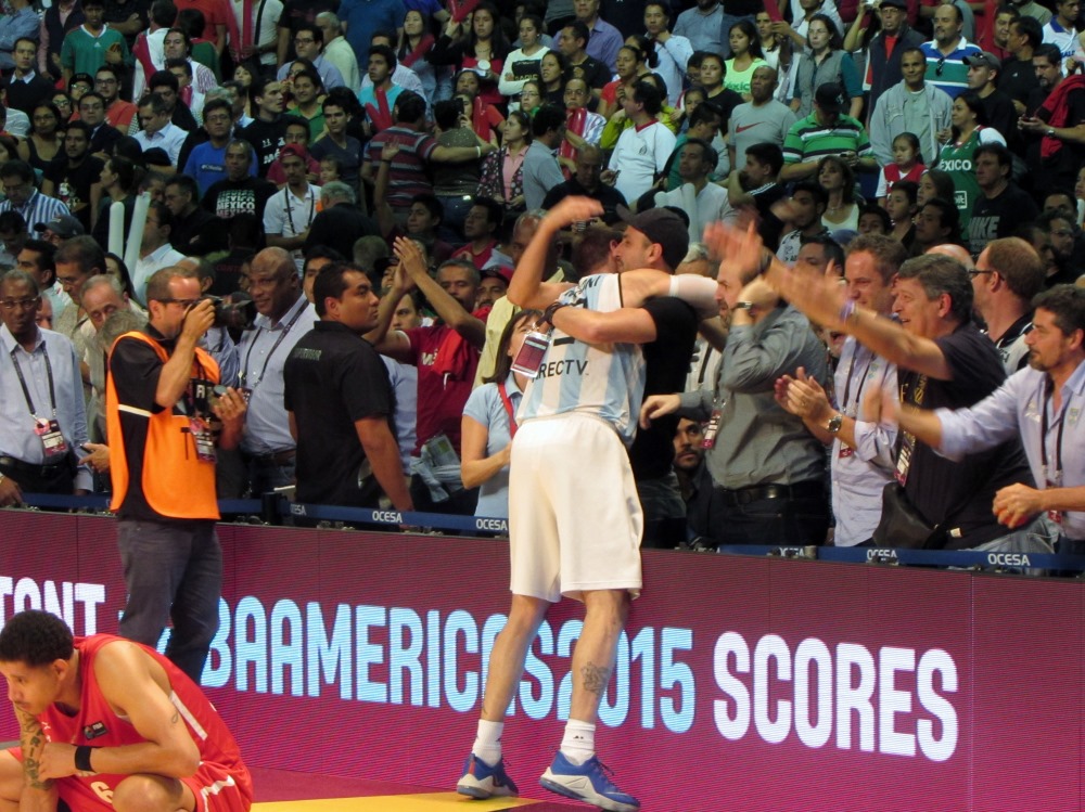 Nocioni y Manu Ginóbili (en la grada) celebran la clasificación de Argentina para los Juegos de Río 2016.