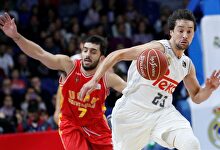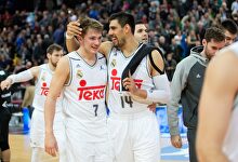 Luka Doncic (7), felicitado por Ayón (14) al final del partido en Bilbao | ACB Photo