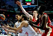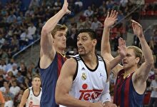 Felipe Reyes lucha por un rebote con Romain Duport (2d) y Bangaly Fofana. | EFE
