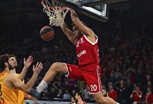 Elias Harris machaca el aro ante Perperoglou (i) y Ante Tomic. | EFE
