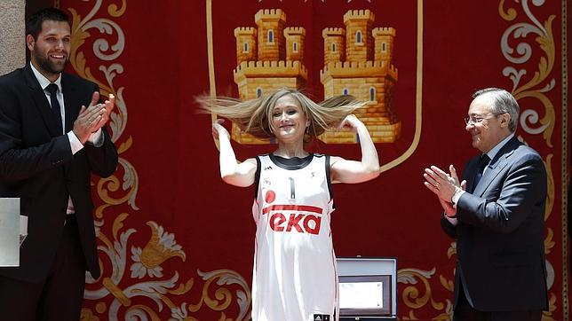 Cristina Cifuentes recibió a la expedición blanca, campeona por tercera vez consecutiva de la Copa del Rey al derrotar ayer en la final de La Coruña al Herbalife Gran Canaria, en la sede de la Real Casa de Correos, con toda la plantilla encabezada por el presidente Florentino Pérez y el entrenador Pablo Laso.