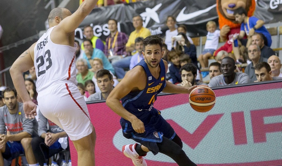 España, 85: Rudy Fernández (-), Felipe Reyes (13), San Emeterio (5), Mirotic (19), Ricky Rubio (2) -quinteto inicial-; Navarro (3), Calderón (6), Víctor Claver (2), Diop (4), Hernangómez (8), Pau Ribas (7) y Álex Abrines (16)