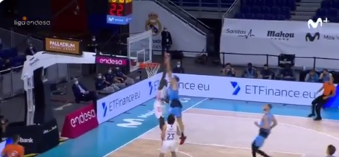 El pívot terminaría con 8 puntos, 3 asistencias, 2 tapones y 16 de valoración y una jugada defensiva a destacar. Un tapón que puede estar entre los mejores del año en España. Hay que fijarse en dónde pone la mano, muy arriba.